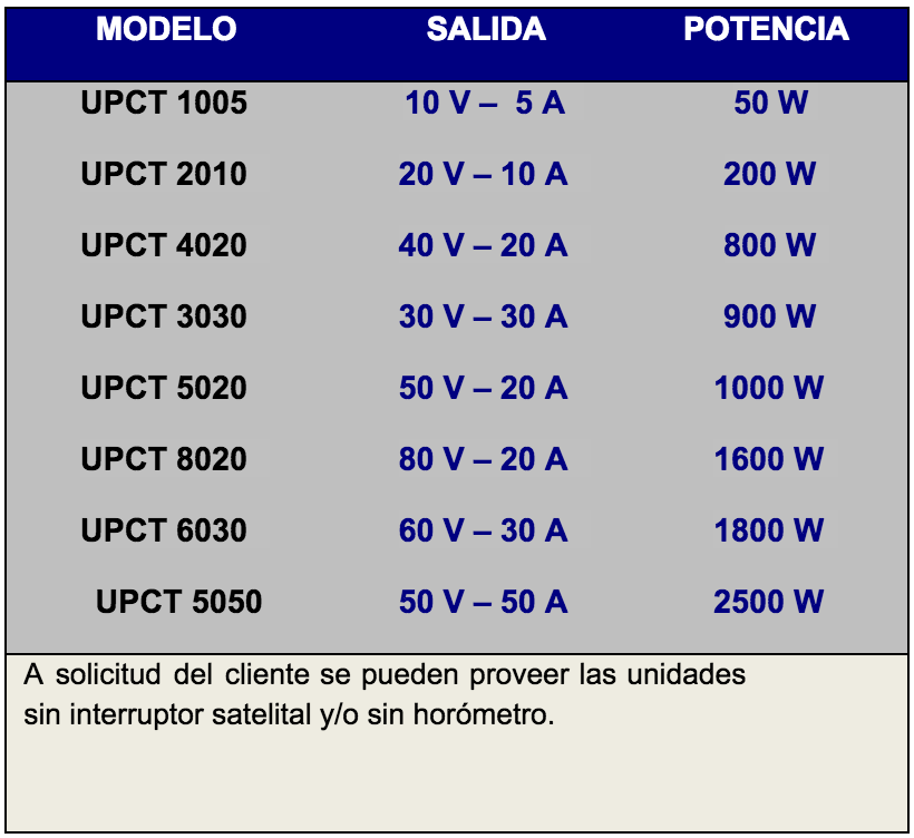 La siguiente tabla resume los modelos estándar de los UPCT (automáticos)